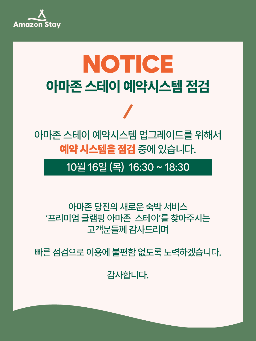 '아마존스테이' 예약시스템 업그레이드를 위해서 [ 예약 시스템 점검 ] 중에 있습니다.